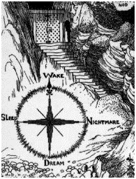 Carved over the long years by neophytes into the very stone of the mountain, a long series of smooth stone steps lead up towards the dwarven monastery (03.04). The stairs are splotched badly with dove droppings for many of these sacrificial birds flock around the Long Stairs. Some of them have had their feathers dyed orange in honor of the holy color of The Drinker of Iron so that the monks can judge the auspices by watching the course of their flight among their white brothers. The doves also serve to alert the monks to intruders for they always fly into the air in one vast peeping cloud at the approach of strangers.
