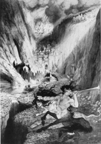 This rugged pine forest belongs to the centaurs of the Paion tribe. In the fractured land of Gore, they thrive as bandits. They waylay travelers with thundering hooves, steel tridents and nets of spider silk (3.19). Their favorite loot includes wine, smoked meat and astrology tomes. The tribal shaman, Knoss, uses the latter to conduct moonlit ceremonies at the Fools’ Court (5.18). The ceremonies change from solemn to raucous as soon as the first flagon wine is poured. Their hoots and stomps echo through the hills until well after daybreak.