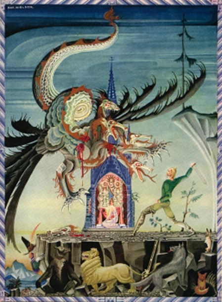 A green dragon named Celadon dwells in this wood. Using his sinuous body and stubby legs, he can slither up tree trunks like a boa constrictor to watch for his favorite prey: questing knights of Thring. He is not particularly old, mighty or cruel, but Celadon is unusual among dragons for not having a single massive hoard. Instead, he buries is loot in many places across the forest. The kobolds that spring from Celadon’s dreams gravitate towards these stashes. Those who evade wolves, feral ostriches and knights cobble together dens around the hidden treasure. These dens are filled with traps that guarantee adventurers won’t dig anything up without a mangling. And treasure hunters who do retrieve loot must also contend with Celadon himself.