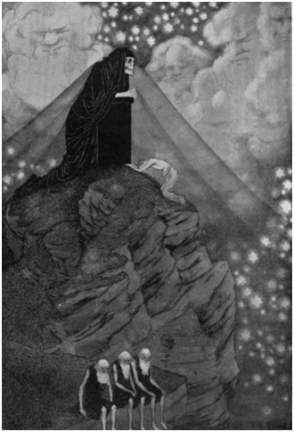 For a hermitage, the cave is strangely bustling and at its heart lies a radiant ball of light that stands immobile in the air and which shines especially brightly on cloudy nights. The hermits gather around it in meditation and as all worries flow from their minds their bodily functions slow and gradually stop until they die in ecstasy.