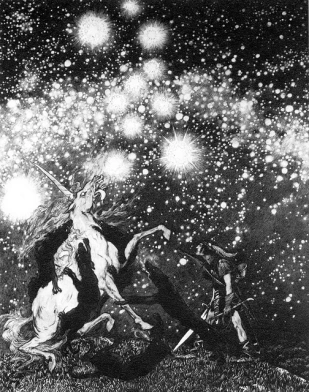 As was bound in the bargain by that fey prince of old, a door to the Holt of the elves (29.07) was forced to open where the unicorn was grazing. Expecting this, Vartan had set up a wooden door without a frame and propped it against the rock wall. At the moment of noon, the door fused to the stone and became as it is today - a portal into one of the fey paths. Vartan’s bandits leapt up from their hiding-spots and rushed through the door. Their goal was nothing less than a surprise attack on the Holt, the capital of the elves itself.