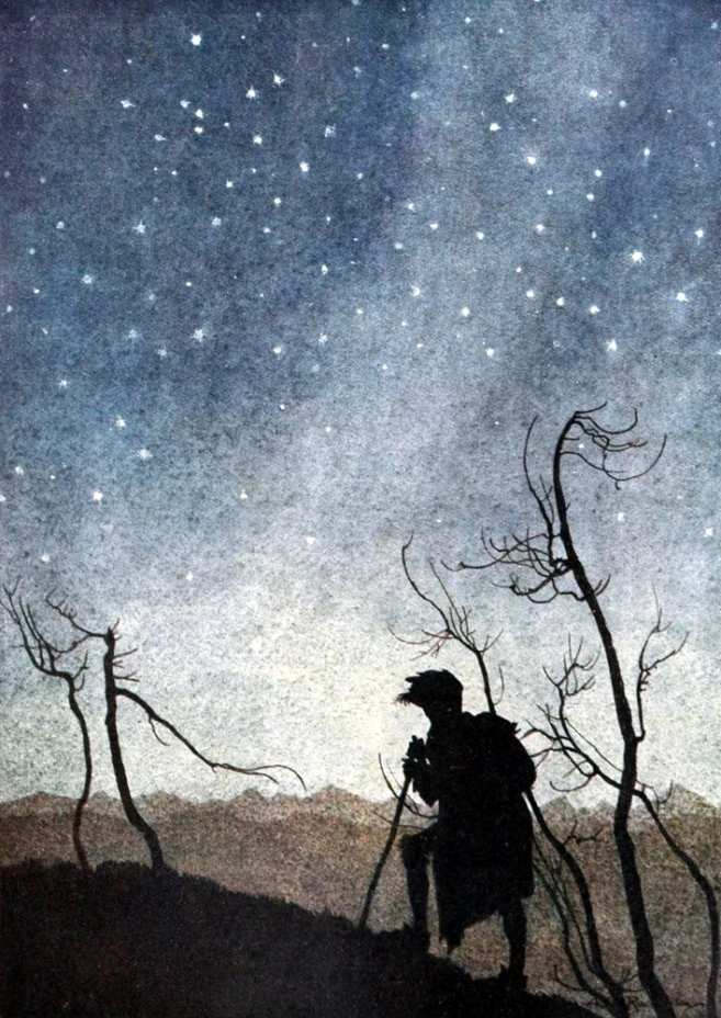 True blackness is cold and is above, not below, in the darkness behind the stars. Every so often a chunk of this darkness falls to earth, burning the air around it so that it looks almost like a star.