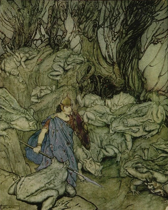 She entertained a mad hope that her brother would somehow still be alive within the warg’s belly but, alas, it was far too late for him. Nevertheless, she gathered up his splintered bones from the warg’s gut and set off into the Kingswood in search of the Hierophant, for Syla had heard stories of her great magics. After weeks of searching Syla found the Hierophant and fell weeping at her feet and the old elf took pity on her and returned Slya’s brother to life and the boy leapt with many happy ribbits from the Hierophant’s hands. Even today the descendants of Syla’s brother can be found along the banks of the Witchwater, but now are difficult to find outside of a few secluded bits of riverbanks since the previous Duke of Thring (16.16) sent his knights at great risk to gather the talking frogs so that they might be used for a great sorcery.