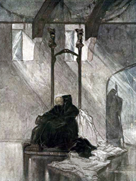 The shadowy spirit in the Throne whispered to the son lies that his father planned to pass him over in favor of another relative. Incised, the son murdered his father, and with this assassination the secret rites were lost. Since then the Hell-born spirit has whispered darkly into the minds of all who have sat upon it. It cannot directly control, but it knows the fears, weaknesses and insecurities of those who sit upon it, and masks its telepathic voice as that of the lord who sits upon the Throne, and so leads them to believe its lies and dark suggestions are their own thoughts.